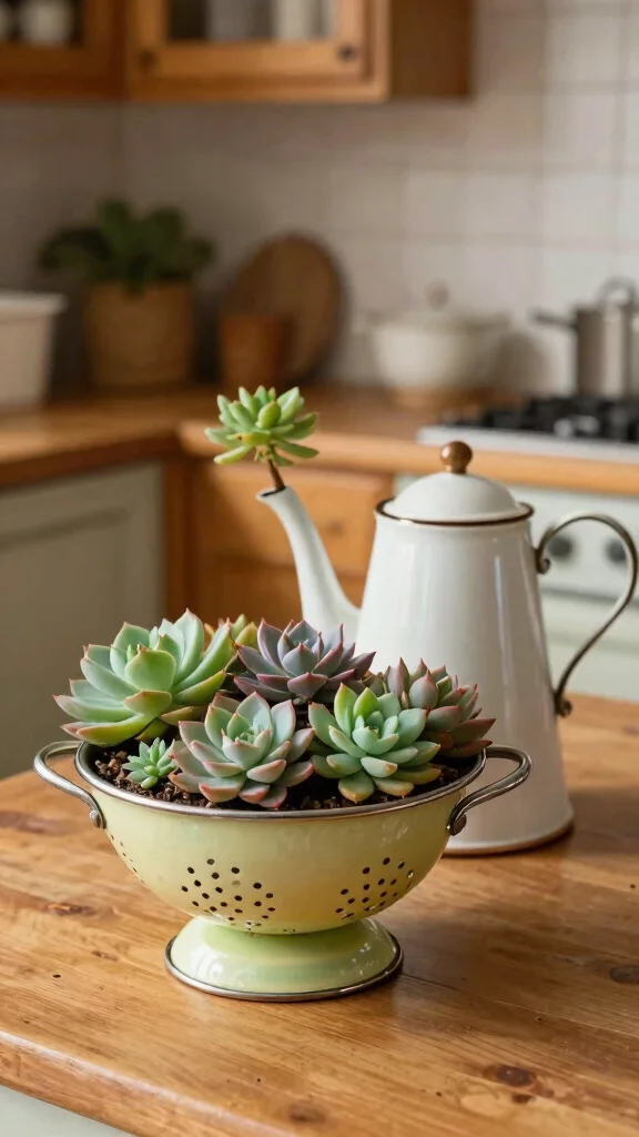 Don’t let your old kitchenware gather dust; transform it into quirky succulent planters! Items like colanders, teapots, or bowls can add unexpected charm and personality to your plant displays. This creative approach not only beautifies your home but also gives new life to items you might otherwise discard.